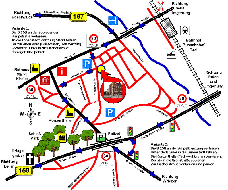 Anfahrten mit dem Auto sind z.B. über die B 167, B 158, Hauptstraße, Grünstraße, Fischerstraße und Wasserstraße günstig. Eine Anreise per Bus und Bahn ist auch möglich. Der Eingang zum Büro ist am Giebel des Hauses links. Der Briefkasten ist weiter links in einer zentralen Anlage.