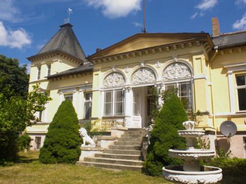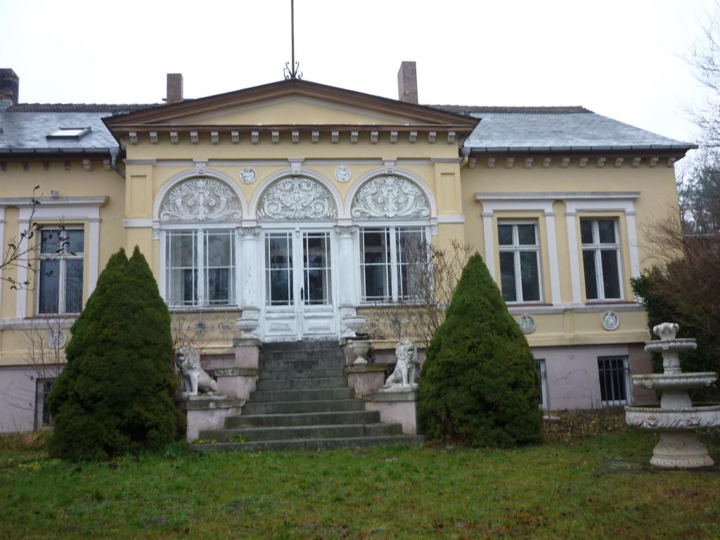 Beschreibung: Es handelt sich um ein repräsentatives Herrenhaus mit Stuckfassade und Turm, auf einem parkähnlich angelegten Grundstück mit altem Baumbestand von ca. 3.000 qm. Vor dem Grundstück verläuft in ca. 300 m Entfernung die Wriezener Alte Oder in Richtung Niederoderbruch. Das Grundstück ist ein leichter Südhang. Hinter dem Grundstück beginnt der Bralitzer Forst (Wald). Zusätzliche gibt es einen Wirtschaftshof, einen Bungalow und diverse Nebengebäude. Das Haus bietet innen und außen sehr viele originale Details der Gründerzeit, wie z.B. Wandmalereien, Wintergarten, aufgearbeitete Kastenfenster, herrschaftliche (Doppel-)Türen, hohe Decken im Erdgeschoss mit Stuck (3,50 m), Echtholzdielen, Kaminöfen in den meisten Räumen.