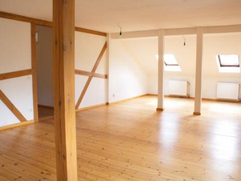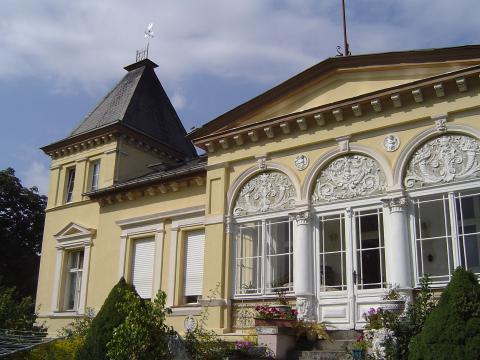Ausstattung: Es handelt sich um einen fast vollständig unterkellerten Massivbau mit einer repräsentativen Wohnung mit Saloncharakter im Erdgeschoss (142,75 m² WF). Die Wohnung verfügt über einen Haupteingang am Giebel, einen Nebeneingang zum Hof und einen Ausgang über die Freitreppe zum Garten. Hervorzuheben sind die Veranda, das Kaminzimmer, die großen Flügeltüren und die zum großen Teil erhaltenen Dielenfußböden. Im Erdgeschoss ist ebenfalls eine separate Kleinwohnung (Appartement mit 24 m² WF) gelegen, mit Zugang vom Hof. Zu DDR-Zeiten wurde vermutlich die Terrasse, die sich hinter dem an das Schlafzimmer der großen Wohnung anschloss, überbaut. Sie ist jetzt das Wohn-/Schlafzimmer, zusammen mit einem Bad und einer Küche (unter dem Turmzimmer), der Kleinwohnung am Westgiebel (31,18 m² WF). Über den Nebeneingang zum Hof gelangt man in ein Treppenhaus das u.a. zu den beiden im Dachgeschoss ausgebauten Wohnungen führt. Am Ostgiebel ist eine 2-Raum-Wohnung gelegen (64 m² WF), deren Besonderheit ist, das die Räume aufgrund der Struktur des Haus auf unterschiedlichen Höhen liegen. Das Schlafzimmer liegt über dem unteren Appartement und somit einige Stufen unter dem Rest der Wohnung. Über großen Teilen des Erdgeschosses befindet sich die 4-Raum Wohnung (101 m² WF) mit Kaminofen und offener Küche. Einige Dachschrägen und Balken geben dieser Wohnung ein rustikales Aussehen. Das Turmzimmer (nahezu quadratisch, mit Decken-Rosette für einen Lüster) ist das Schlafzimmer dieser Wohnung.