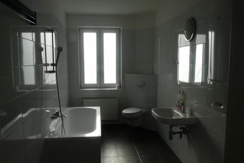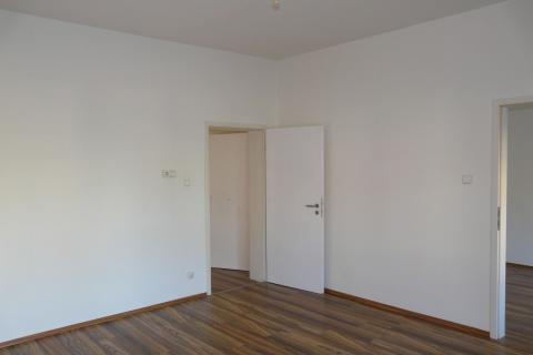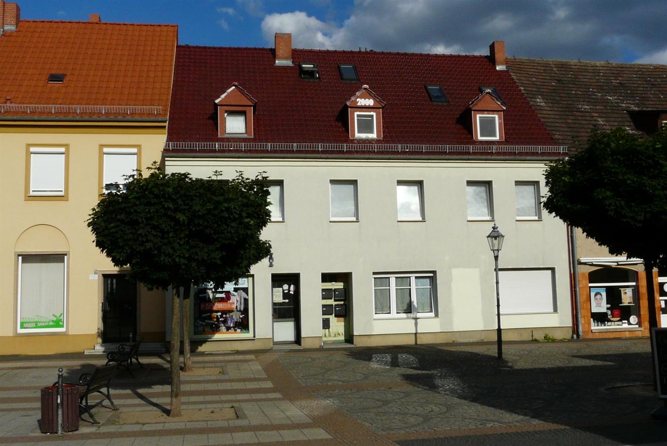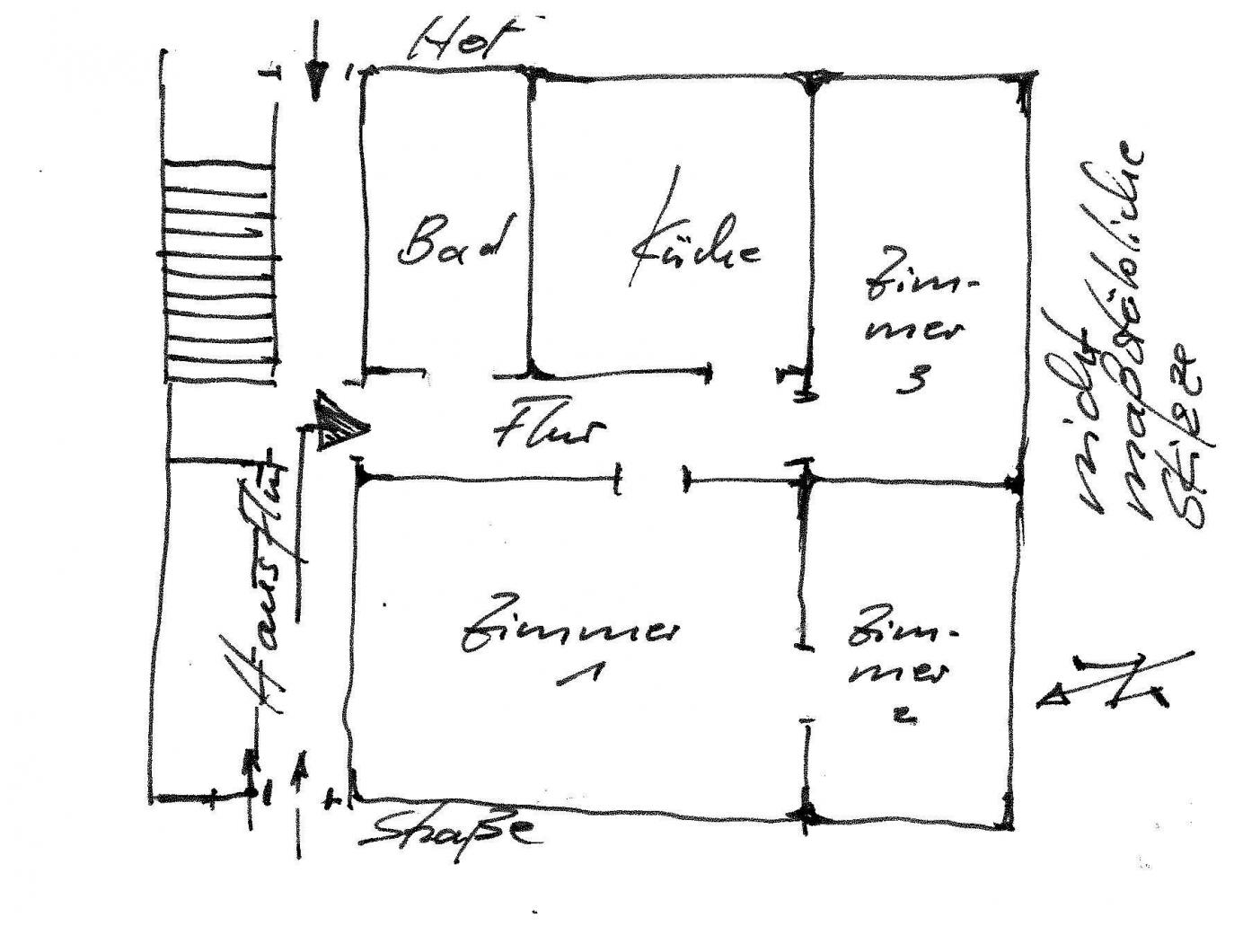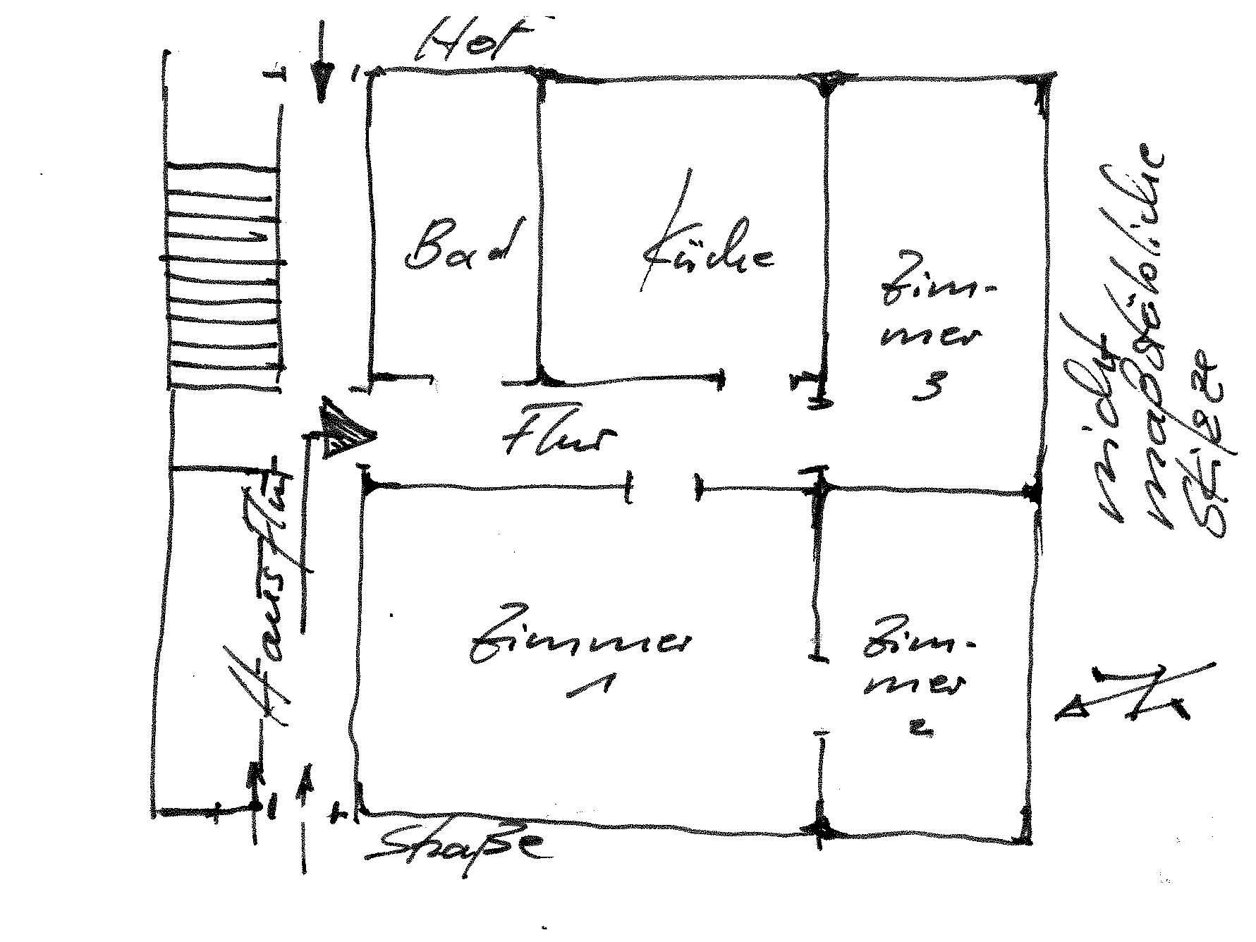 Beschreibung: Der Altbau, ein massives bürgerliches Wohnhaus mit Geschäftsunterlagerung, bestehend aus den Ebenen Dachgeschoss, erstes Obergeschoss, Erdgeschoss und Keller, wurde vermutlich Anfang des 20. Jahrhunderts gebaut, nach dem Krieg repariert und ab den 90er-Jahren der umfassenden Sanierung unterzogen. Im Erdgeschoss sind ein Laden und die angebotene 3-Raum-Wohnung gelegen. Der untere Hausflur hat eine Nebeneingangstür zum Hof. Die Aufteilung wiederholt sich im ersten Obergeschoss und im Dachgeschoss, wobei über den Geschäftsräumen Kleinwohnungen liegen. Das Haus verfügt über den Wohnungen zugeordnete Mieterkeller, deren Nutzung geduldet wird. Der Hof umfasst eine Grünfläche, einer kleinen Garage und einen Stellplatz für die Abfallbehälter. Das Hoftor ermöglicht die Entsorgung der Behälter. Der Grundriss der Wohnung besteht aus einem Mittelflur. Zur Wilhelmstraße hin sind zwei größere Wohnräume gelegen. Zum Hof orientieren sich Bad, Küche und ein kleinerer Wohnraum. Die Front des Hauses und ausgebaute Dachboden sind wärmegedämmt.