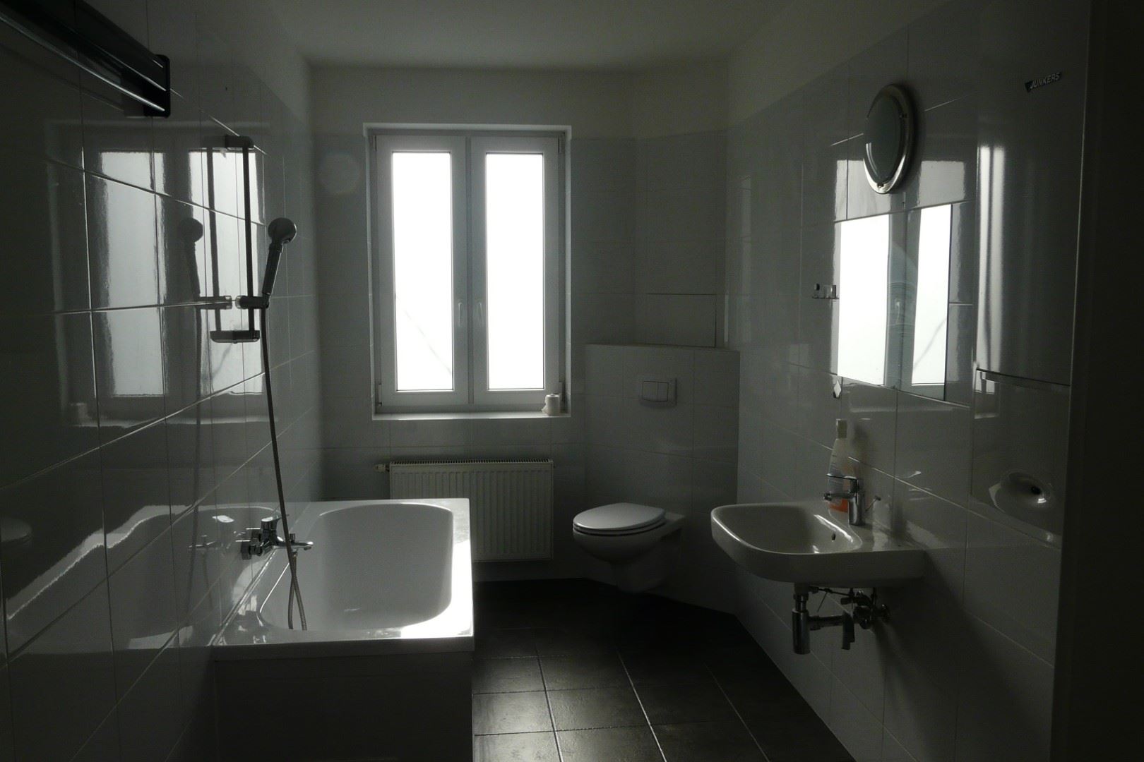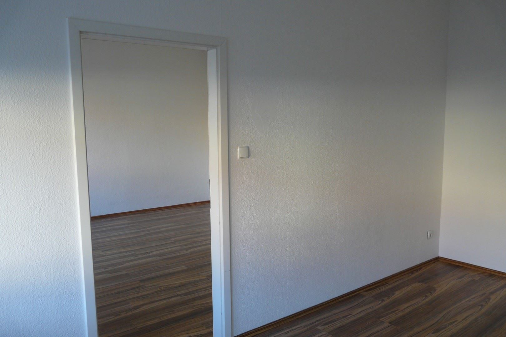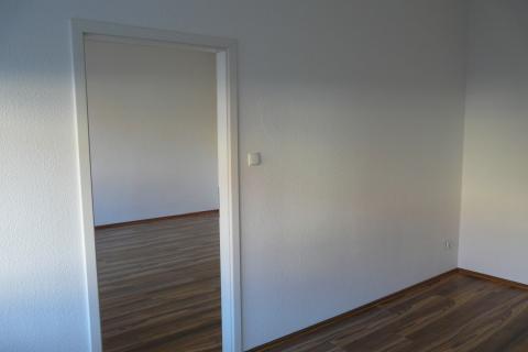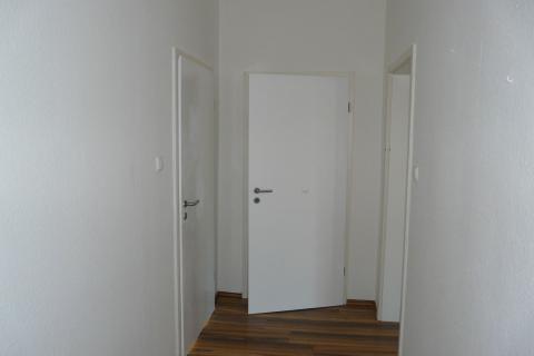 Ausstattung: Die Nichtraucher-Wohnung hat eine Einzelheizung (Gas-Therme mit Warmwasserbereitung) mit dem Standort Bad. Das Bad ist ein Wannenbad mit Waschtisch und WC. Hinter dem Bad liegt die Küche (mit kurzen Wegen zur Warmwasserversorgung) mit Fenster zum Hof. Dahinter ist der kleine Wohnraum verortet. Der Flur verzweigt nach rechts zum Wohn- und Schlafzimmer. Beide haben Jalousien an den Fenstern. Das Wohnzimmer ist ein Durchgangszimmer. Die Wände sind überwiegend, Raufaser weiß, Anstrich weiß und Fliesen. Die Fußböden sind in Fliesen, Kunststoff bzw. Laminat ausgeführt. Im Flur ist der Sicherungskasten vorhanden.