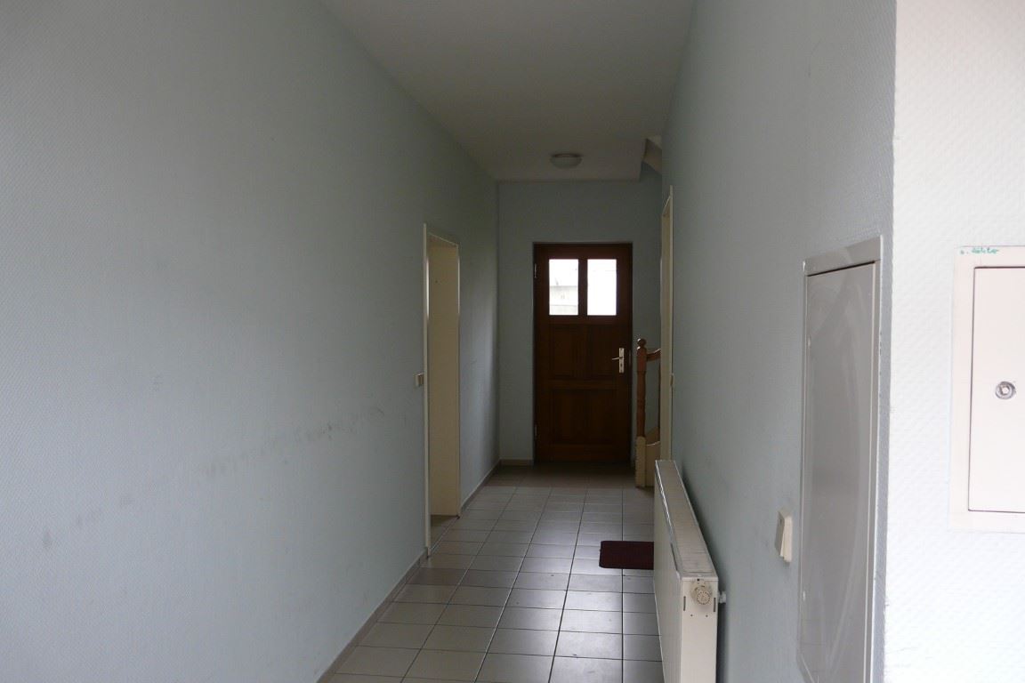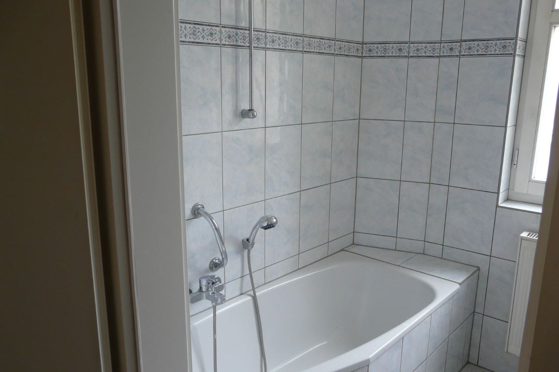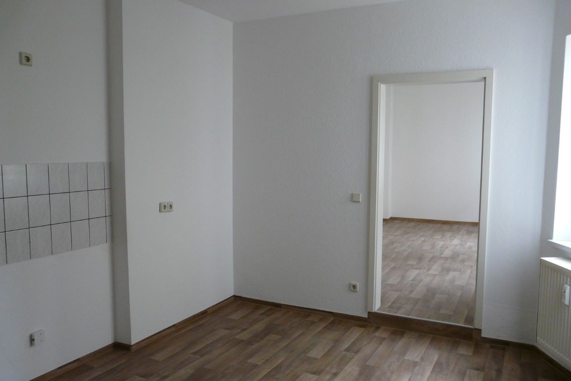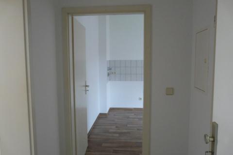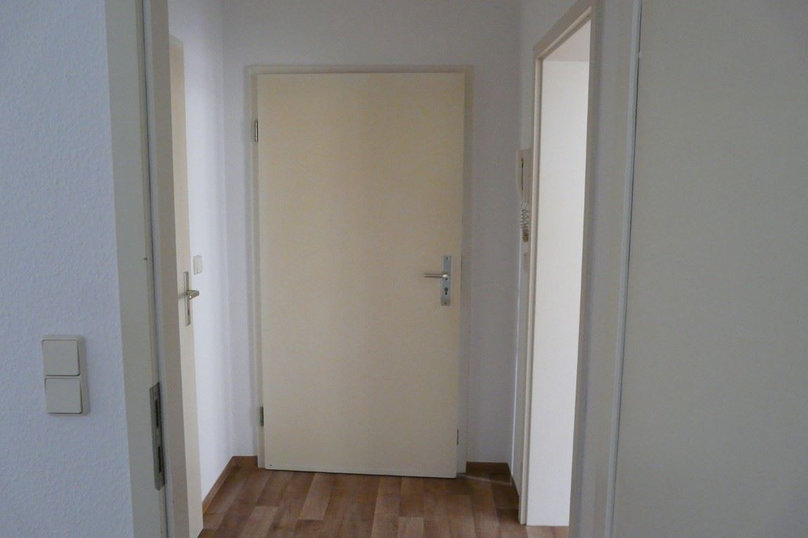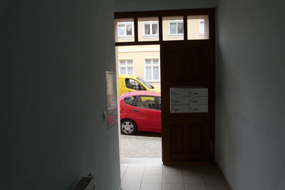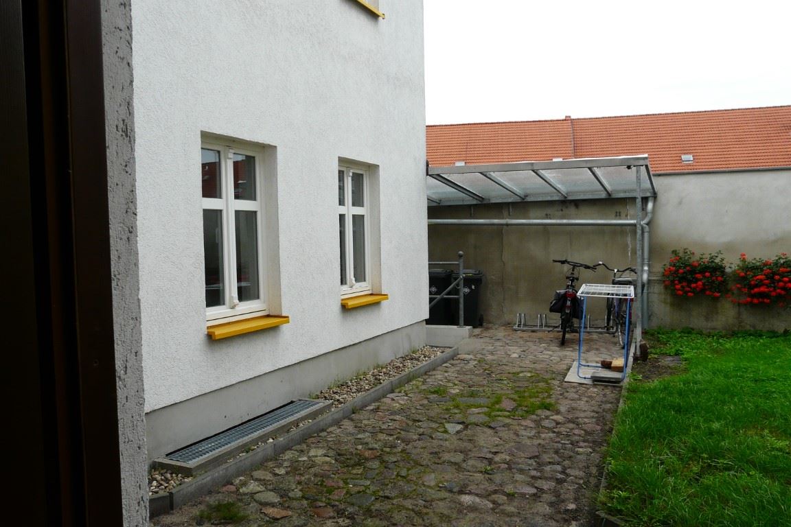Ausstattung: Zur Wohnung (EGL) sind nur zwei Stufen am Hauseingang zu überwinden. Der Hausflur führt zu einem kleinen Hof mit Wiese, Unterstellmöglichkeit für Fahrräder und einem verdeckten Stellplatz mit Mülltonnen. Die Wohnung liegt im Hausflur unten links. Von der Wohnungseingangstür aus betritt man den Flur mit Türen zum Wannenbad (rechts), zur Küche (geradeaus) und zum Wohnzimmer (links). Der Flur weist den Sicherungskasten, die Wechselsprechanlage und den Telefon- / Internetanschluss auf. Das raumhoch geflieste Wannenbad mit Fenster zum Hof hat neben der Wanne, einen Waschtisch und ein WC. Das Wohnzimmer hat zwei Fenster zur Straße und ist fast quadratisch. Die Küche ist ein größerer Raum mit einem Fenster zum Hof. Geradezu wurde ein Fliesenspiegel und die für die Küche üblichen Anschlüsse installiert. Dort ist auch ein Stellplatz für die Waschmaschine vorgesehen. Von der Küche gelangt man über eine Stufe nach rechts in Schlafzimmer mit Fenstern zum Hof (ruhig und sonnengeschützt). Die Räume wurden kürzlich renoviert und mit einem neuen Fußbodenbelag in Laminatoptik ausgestattet. Kabel-Fernsehempfang ist über die Fa. PÜUR möglich, die eventuell auch Internet anbietet. Die gesamt Wohnung hat Zentralheizung und zentrale Warmwasserversorgung. Die Heizkörper sind unter den Fenstern montiert.
